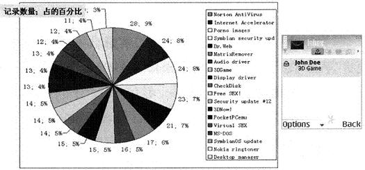 當(dāng)用戶打開含有CommWarrior病毒的MMS消息后,該病毒將在手機(jī)中進(jìn)行安裝,并開始向手機(jī)號(hào)碼薄中的用戶隨機(jī)發(fā)送含有自身拷貝的MMS消息。同時(shí),CommWarrior會(huì)偽造彩信主題進(jìn)行傳播,通常包含著這樣的內(nèi)容“來自我的3D游戲!免費(fèi)!”以及“適合所有型號(hào)諾基亞手機(jī)的鈴聲”等,使得接受彩信的用戶不會(huì)引起警覺,具體各類的消息內(nèi)容的比例如圖2所示。