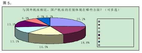 據(jù)中國(guó)機(jī)床工具工業(yè)協(xié)會(huì)統(tǒng)計(jì),2010年我國(guó)機(jī)床工具產(chǎn)品進(jìn)口總額為157.2億美元,同比增長(zhǎng)62.0%,國(guó)內(nèi)機(jī)床進(jìn)口額與歷史最高的2008年同期相比還增長(zhǎng)了27.8%,創(chuàng)歷史新高。進(jìn)口的增長(zhǎng)迅猛表明國(guó)內(nèi)機(jī)床與國(guó)外機(jī)床的差距依然很大。本次調(diào)查報(bào)告顯示,中外機(jī)床的差距主要體現(xiàn)在三個(gè)方面:加工精度(25.2%)、可靠性(18.8%)、機(jī)床內(nèi)部電、氣、控等配置(16.5%)。緊跟其后的是加工速度和外形方面的色彩、精美程度等,均占13.1%(詳見(jiàn)圖5)。由此可見(jiàn),技術(shù)尤其是對(duì)精準(zhǔn)度和可靠度是國(guó)外機(jī)床領(lǐng)先國(guó)內(nèi)機(jī)床的優(yōu)勢(shì)來(lái)源。另外,對(duì)外形的關(guān)注也是近年來(lái)客戶(hù)在使用方面出現(xiàn)的一種新口味。