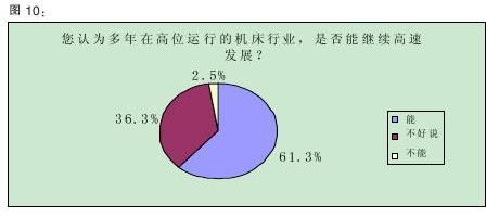 據(jù)年初中國(guó)機(jī)床工具工業(yè)協(xié)會(huì)的預(yù)測(cè),2011年機(jī)床行業(yè)總體增幅將大于10%。從本次調(diào)查的情況來(lái)看,業(yè)界對(duì)行業(yè)的增長(zhǎng)預(yù)期要比協(xié)會(huì)方面直接和樂(lè)觀許多,有61.3%的受訪者認(rèn)為,多年來(lái)高位運(yùn)行的機(jī)床行業(yè)“能繼續(xù)高速發(fā)展”,而持“不能”態(tài)度的人僅占2.5%(詳見(jiàn)圖10)。