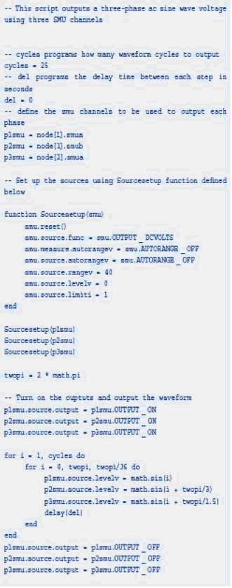這部分包含許多腳本例子說明吉時利支持腳本的儀器的一些特點(diǎn)。圖1示出了兩臺吉時利系統(tǒng)源表如何使用單腳本控制產(chǎn)生3相交流波形。在這個例子中,使用吉時利的TSP-Link技術(shù)連接這兩臺儀器,因而很容易用腳本控制這兩臺儀器。
