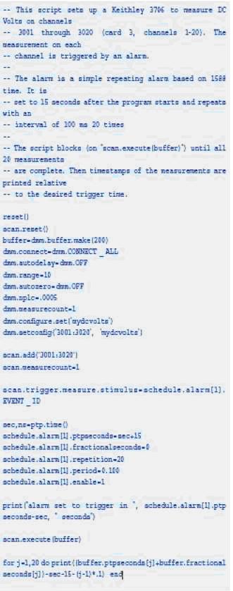 圖2說明了基于LXI Class B技術(shù)的定時器如何控制腳本工作。在此腳本中,吉時利3706型LXI Class B儀器使用基于IEEE 1588的計時器排列一系列測量的順序。LXI Class B的定時特點(diǎn)特別適合避免或最小化由延遲或通信時延導(dǎo)致的系統(tǒng)時延。