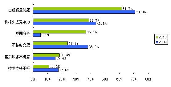 在缺貨的大環(huán)境下,不少電子系統(tǒng)制造商被迫更換供應商。導致合格供應商降級的最主要因素依次是物料出現質量問題、價格失去競爭力和貨期變長。物料質量問題在任何情況下都是不可妥協(xié)的;價格失去競爭力也就是價格上漲壓縮了下游公司的利潤空間;而貨期變長導致供應商降級的比例變化最顯著,由2009年的5.2%大幅上升至2010年的36.8%——這是供應鏈調整的表現。因此,系統(tǒng)廠商在考察新供應商時,除了考察物料質量因素外,產品性價比和供貨能力也是重要的考慮因素。