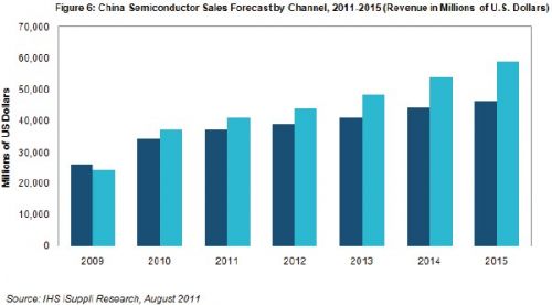 圖中所示為IHS iSuppli公司對中國半導(dǎo)體銷售額的預(yù)測,按渠道細(xì)分。