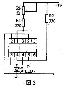 光電耦合器檢測電路如圖3所示,可將TLP621等四個引腳的光電耦合器插入插座左端的四個引腳的插孔中,將TLP332等六個引腳的光電耦合器插入插座右端的六個引腳的插孔中。接通電源后,電源經RP、R1給IC中的發(fā)光二極管提供一個正向電壓,發(fā)光二極管發(fā)光,使IC中的光電三極管導通,3腳外接的發(fā)光二極管D發(fā)光,若調節(jié)RP時,發(fā)光二極管的亮度能跟著變化,則被測光電耦合器是好的。