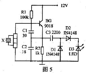 石英晶振檢測電路如圖5所示,BG與C1、C2、石英晶振X等組成高頻振蕩電路,C3、D1和D2組成二倍壓整流電路。將被測石英晶振插入插孔中,接通電源后,若發(fā)光二極管D3能持續(xù)發(fā)光,則被測石英晶振是好的。