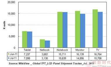 據(jù)市調(diào)機(jī)構(gòu)WitsView公布最新7月份大面板出貨調(diào)查報(bào)告,2011年7月份大尺寸面板出貨量為5,643萬片,較6月份減少5.2%,較去年同期成長11%。WitsView預(yù)估,第3季出貨季增率只有1%至3%,出貨表現(xiàn)旺季不旺,季增率將是史上第3差。