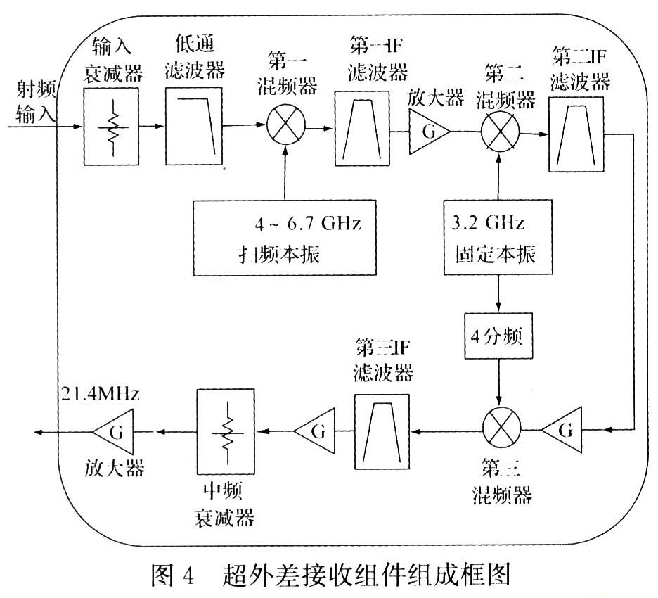 組件采用三級(jí)混頻方式實(shí)現(xiàn),第一中頻4 021.4 MHz,第二中頻821.4 MHz,第三中頻21.4MHz,這樣選擇的目的是第三混頻需要的800 MHz本振可以由第二混頻需要的3.2 GHz本振4分頻產(chǎn)生,從而減少了本振數(shù)量,降低了體積。