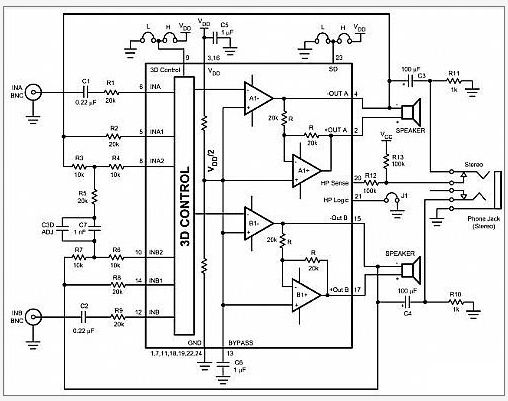 觀察到的3D數(shù)量也取決于其它許多因素,如喇叭的放置及與收聽者的距離。因此,建議用戶嘗試R5(R3D)和 C7(C3D)的各種數(shù)值,以感覺3D效應(yīng)如何在應(yīng)用程序中工作。對(duì)于效果來(lái)說沒有什么對(duì)或錯(cuò),而只是使每位用戶達(dá)到最滿意的程度問題而已。請(qǐng)注意當(dāng)啟動(dòng) 3D模式時(shí),(R3和R4),(R7和R6)的設(shè)置僅用于增益控制。當(dāng)抑制3D模式時(shí),增益由R2和R8設(shè)置。