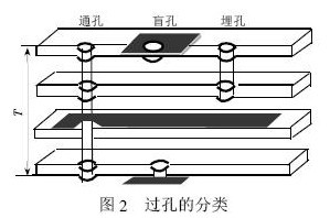 通孔,這種孔穿過(guò)整個(gè)線路板,可用于實(shí)現(xiàn)內(nèi)部互連或作為元件的安裝定位孔。由于通孔在工藝上更易于實(shí)現(xiàn),成本較低,所以一般印制電路板均使用通孔。過(guò)孔的分類如圖2 所示。