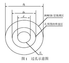 過(guò)孔是多層PCB 設(shè)計(jì)中的一個(gè)重要因素,一個(gè)過(guò)孔主要由三部分組成,一是孔;二是孔周圍的焊盤區(qū);三是POWER 層隔離區(qū)。過(guò)孔的工藝過(guò)程是在過(guò)孔的孔壁圓柱面上用化學(xué)沉積的方法鍍上一層金屬,用以連通中間各層需要連通的銅箔,而過(guò)孔的上下兩面做成普通的焊盤形狀,可直接與上下兩面的線路相通,也可不連。過(guò)孔可以起到電氣連接,固定或定位器件的作用。過(guò)孔示意圖如圖1 所示。