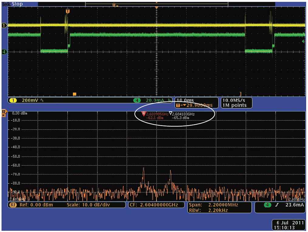 上圖是在使用干凈的實驗室電源供電的模塊中獲得的,這在實際環(huán)境中很難實現(xiàn),但可以作用實用參考。圖4顯示了相同的RF信號,但使用升壓型開關電源為無線電模塊供電。升壓穩(wěn)壓器因產(chǎn)生噪聲而臭名昭著,但它允許使用一個或兩個堿性或鎳鎘單元及相對較少的器件,降低了成本。注意被調制信號底部的噪聲提高。在發(fā)送的信號附近,噪聲至少要比干凈的電源高5 dB。噪聲已經(jīng)容易地顯現(xiàn)在電流波形和電壓波形中。額外的噪聲還會令從發(fā)射機收集這些數(shù)據(jù)所使用的接收機上的信號信噪比劣化,降低無線電系統(tǒng)的有效范圍。