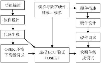 汽車電子產(chǎn)品是軟硬件結合的嵌入式系統(tǒng)。為了節(jié)約資源,縮短產(chǎn)品開發(fā)周期,一般應采取軟硬件同步開發(fā)的方案。汽車電子產(chǎn)品的開發(fā)工具對軟硬件的同步開發(fā)、調試提供了很好的支持。汽車電子產(chǎn)品的軟件開發(fā)分為功能描述、軟件設計、代碼生成、操作系統(tǒng)環(huán)境下高級調試等步驟。汽車電子產(chǎn)品的硬件開發(fā)分為硬件描述、硬件設計、硬件調試等步驟。當軟件設計完成后,通過使用相應的工具,完成在虛擬ECU平臺上的驗證。當硬件設計完成后,與硬件一起進行軟硬件集成調試。通過這種開發(fā)方式,縮短了產(chǎn)品上市的時間。