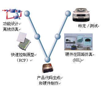 汽車電子產(chǎn)品軟件開發(fā)流程是“V”形開發(fā)流程。“V”形開發(fā)流程分為五個階段,即功能設計、原型仿真、代碼生成、硬件在回路仿真-HIL、標定。