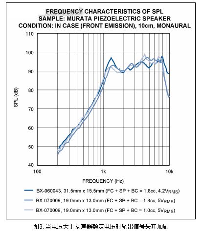 陶瓷揚(yáng)聲器制造商通常規(guī)定了揚(yáng)聲器的最大驅(qū)動(dòng)電壓,典型值15VP-P。電壓最大時(shí)陶瓷器件的偏移量達(dá)到極限。外加電壓大于額定電壓時(shí)不會(huì)導(dǎo)致聲壓升高,反而增加了輸出信號(hào)的失真度。圖3為電壓最大時(shí),陶瓷揚(yáng)聲器輸出聲壓(SPL)與頻率的關(guān)系曲線(xiàn)。通過(guò)對(duì)比SPL與頻率的關(guān)系曲線(xiàn)圖以及阻抗與頻率的關(guān)系曲線(xiàn)圖,可以明顯看出壓電揚(yáng)聲器產(chǎn)生高SPL時(shí),在自激頻率處效率最高。