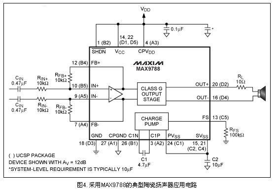 圖4中的MAX9788采用一個(gè)片上電荷泵產(chǎn)生與VDD相反的負(fù)電源電壓。當(dāng)輸出信號(hào)需要高壓驅(qū)動(dòng)時(shí),負(fù)電源電壓作用于輸出級(jí)。MAX9788提供了一種驅(qū)動(dòng)陶瓷揚(yáng)聲器的優(yōu)化方案,比采用AB類(lèi)放大器和升壓轉(zhuǎn)換器的傳統(tǒng)方案更高效。