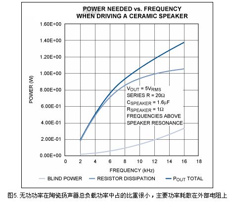 驅(qū)動(dòng)10Ω串聯(lián)電阻的陶瓷揚(yáng)聲器時(shí),總負(fù)載功率中無(wú)功功率占的比重并不大。大部分功率耗散在外部電阻上,圖5為放大器功率與頻率的關(guān)系曲線(xiàn)。