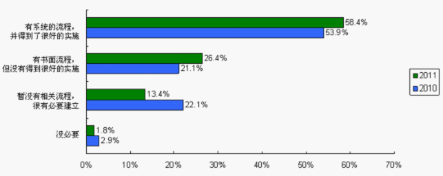 供求雙方把伙伴關(guān)系建立在專業(yè)評(píng)估的基礎(chǔ)上,通過(guò)系統(tǒng)流程可以有效減少供應(yīng)商認(rèn)證和引入過(guò)程中的不合理操作、暗箱操作、防范采購(gòu)風(fēng)險(xiǎn)、提高采購(gòu)效率。在供應(yīng)商認(rèn)證與引入過(guò)程中,沒(méi)有建立和認(rèn)為沒(méi)必要建立系統(tǒng)流程的受訪者比例由2010調(diào)查的25%(22.1%+2.9%)降至2011調(diào)查的15.2%(13.4%+1.8%),已經(jīng)建立流程并且得到很好實(shí)施的比例也由2010調(diào)查的53.9%上升至2011調(diào)查的58.4%。