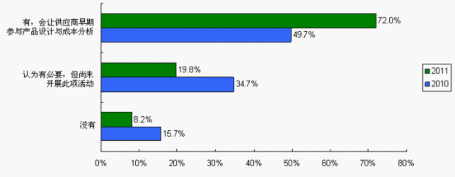 讓供應(yīng)商參與早期的產(chǎn)品設(shè)計(jì)是增進(jìn)供求雙方伙伴關(guān)系的途徑之一,借助供應(yīng)商的技術(shù)優(yōu)勢(shì),挖掘元器件成本空間,從而提高產(chǎn)品競(jìng)爭(zhēng)力、加快產(chǎn)品上市、降低成本。讓供應(yīng)商早期參與產(chǎn)品設(shè)計(jì)與成本分析由2010調(diào)查的49.7%大幅上升至2011調(diào)查的72%,而其中69.2%是主芯片供應(yīng)商的參與,30.8%是被動(dòng)元件供應(yīng)商的參與。