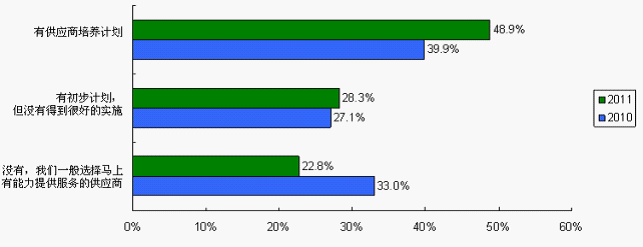 培養(yǎng)供應(yīng)商有利于建立供求雙方的伙伴關(guān)系,提高供應(yīng)商忠誠(chéng)度,增強(qiáng)采購(gòu)風(fēng)險(xiǎn)抵御能力。有供應(yīng)商培養(yǎng)計(jì)劃的系統(tǒng)廠商由2010調(diào)查的39.9%上升至2011調(diào)查的48.9%,而沒(méi)有計(jì)劃的由2010調(diào)查的33%降至22.8%。