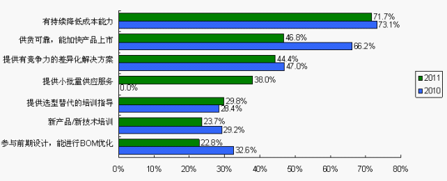此外,工程師對(duì)成本降低持續(xù)關(guān)注,小批量供應(yīng)服務(wù)成為工程師關(guān)注的亮點(diǎn)。隨著市場(chǎng)的企穩(wěn),供貨可靠不再變成重大事件。2011中國(guó)電子制造商采購(gòu)行為調(diào)查發(fā)現(xiàn),工程師對(duì)供貨穩(wěn)定可靠的期望由2010調(diào)查的66.2%大幅降至2011調(diào)查的46.8%。