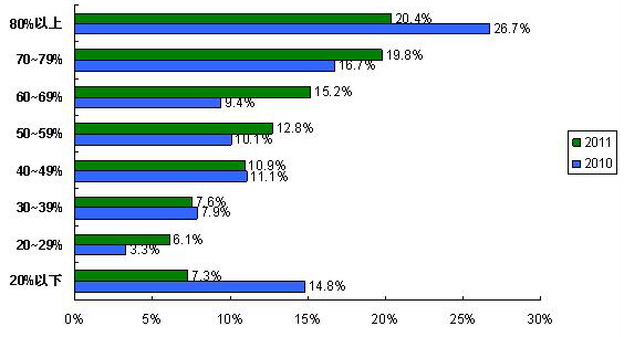 2011調(diào)查中國(guó)外品牌元器件占采購(gòu)總額比例平均為58.6%,比2010調(diào)查的57.1%上升1.5%。采購(gòu)國(guó)外品牌元器件占采購(gòu)總額比例為70-79%、60-69%、50-59%三個(gè)區(qū)段的系統(tǒng)廠商占47.8%,是采購(gòu)的主體,研發(fā)活動(dòng)活躍,這三個(gè)部分呈現(xiàn)出對(duì)國(guó)外品牌元器件需求的快速增長(zhǎng)。而采購(gòu)國(guó)外品牌比例在80%以上和20%以下是采購(gòu)的兩極,這兩極通過(guò)平衡采購(gòu)比例來(lái)分散采購(gòu)風(fēng)險(xiǎn),因此,這兩極的系統(tǒng)廠商數(shù)量比2010調(diào)查有顯著降低。雖然2010年的元器件缺貨給國(guó)產(chǎn)元器件進(jìn)入AVL(合格供應(yīng)商,Approved Vendor List)帶來(lái)機(jī)會(huì),但是該趨勢(shì)還未對(duì)電子元器件供應(yīng)鏈整體產(chǎn)生顯著影響。