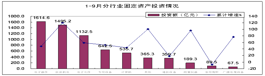 前三季度,電子信息產(chǎn)業(yè)500萬元以上項目完成固定資產(chǎn)投資6492億元,投資額超過去年全年水平近500億元,同比增長62.4%,增速高于工業(yè)投資35.9個百分點。其中9月份完成投資889.6億元,同比增長35.6%,增速比8月下降35.2個百分點,這是今年以來第二個月月度投資增速低于60%。