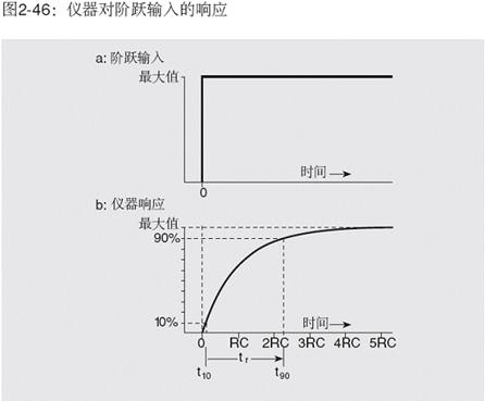 模擬儀器(或模擬輸出)的上升時間一般定義為輸入信號從零立即上升到某一固定值時,輸出信號從最終值的10%上升到90%所需要的時間。此關(guān)系示于圖2-46。圖2-46a示出假定上升時間為零的階躍函數(shù),而圖2-46b示出儀器的響應(yīng)及相應(yīng)的上升時間。單極點(diǎn)系統(tǒng)(1階系統(tǒng))的上升時間、頻率響應(yīng)和RC常數(shù)是有關(guān)聯(lián)的。3dB點(diǎn)由下式給出: