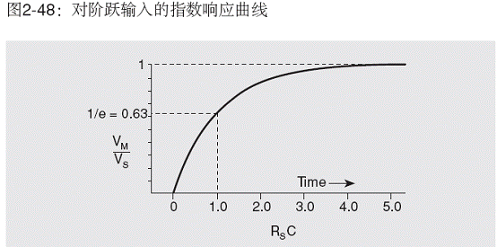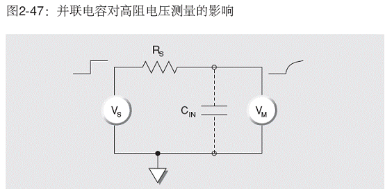 在對高阻抗源進(jìn)行電壓測量時(圖2-47),電壓表(VM)兩端的電容(CIN)必須通過RS充電。輸出電壓對時間的函數(shù)關(guān)系為: