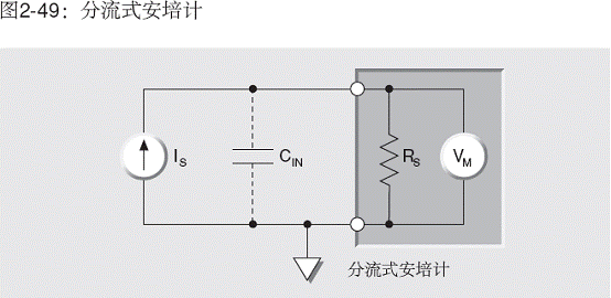 使用分流型安培計(圖2-49)時,輸入電容對電流測量的影響與電壓測量時類似。分流型安培計可以看成是在其輸入端跨接了電阻器的電壓表。電路表明,輸入電容(CIN)必須以時間常數(shù)RSCIN的指數(shù)速率,充電到ISRS伏。注意,CIN是源、連接電纜和儀表電容之和。