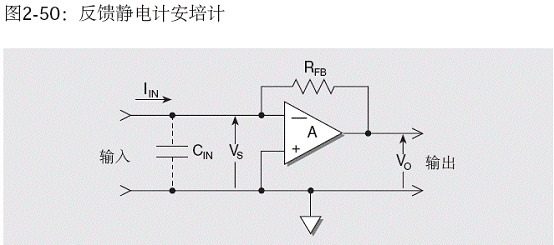 輸入電容對采用負(fù)反饋的電流表的影響與其對分流型安培計的影響不同。這種模式的電路示于圖2-50。