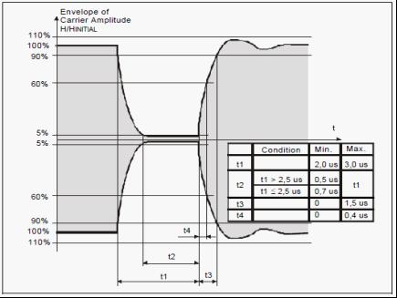13.56MHz高頻RFID系統(tǒng)是目前國(guó)內(nèi)應(yīng)用最為廣泛,技術(shù)較為成熟的射頻識(shí)別系統(tǒng)。相關(guān)的國(guó)際標(biāo)準(zhǔn)對(duì)射頻發(fā)射頻率、信道帶寬、發(fā)射功率等參數(shù)都有明確的要求,特別是RF信號(hào)的幅度(功率)隨時(shí)間變化的情況,標(biāo)準(zhǔn)有著嚴(yán)格的規(guī)定。以讀寫(xiě)設(shè)備為例,讀寫(xiě)設(shè)備發(fā)出的載波信號(hào)的幅度變化時(shí)間,必須符合ISO18000-3標(biāo)準(zhǔn)對(duì)于t1-t4的時(shí)間限制。