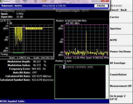 如果設(shè)計(jì)人員希望了解RFID系統(tǒng)傳輸?shù)臄?shù)據(jù)情況,MDO4000同樣可以提供強(qiáng)有力的支持。MDO4000可以提供RF信號(hào)的IQ數(shù)據(jù)。將這些數(shù)據(jù)導(dǎo)入泰克的RSAVu軟件后,可以完成RFID數(shù)據(jù)的解碼、射頻指標(biāo)計(jì)算等工作。如下圖所示,使用RSAVu軟件讀取MDO4000提供的.TIQ數(shù)據(jù),軟件可以計(jì)算得出RF信號(hào)的幅度時(shí)域波形,計(jì)算得出EVM、調(diào)制深度、調(diào)制系數(shù)、頻率偏差、碼速率等參數(shù)。并可以將這些RF信號(hào)代表的數(shù)據(jù)解碼顯示出來(lái)。簡(jiǎn)化了設(shè)計(jì)人員的調(diào)試難度。