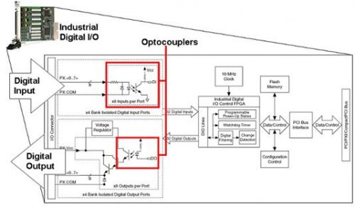 光耦合器,即基于光耦合原理的數(shù)字隔離裝置,是最古老也是最常用的數(shù)字隔離方法之一。它們可耐高壓并提供對電氣噪聲和磁噪聲的高抗干擾能力。光耦合器常用于工業(yè)數(shù)字I/O產(chǎn)品中,如NI PXI-6514隔離式數(shù)字I/O模塊(如圖10所示)和NI PCI-7390工業(yè)運動控制器。