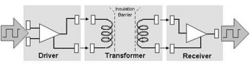 感應隔離技術(shù)使用了一對通過一個絕緣層分離的線圈。該絕緣層防止任何物理信號的傳輸。信號可以通過改變流經(jīng)其中一個線圈的電流進行傳輸,因為這樣會使跨過該絕緣層在第二個線圈中產(chǎn)生類似的感應電流。感應隔離技術(shù)可以提供與電容技術(shù)相似的高速傳輸。但是由于感應耦合涉及到用于數(shù)據(jù)傳輸?shù)拇艌龅氖褂?,因此它易受到外部磁場的干擾。