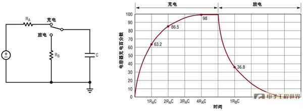 也許最簡(jiǎn)單、最常見的電子電路是電阻器和電容器串聯(lián)后連接到地所形成的電路。如圖 1 所示,當(dāng)電壓加在電阻器上時(shí),電容器上的電壓響應(yīng)會(huì)呈現(xiàn)指數(shù)規(guī)律:VC = VR (1-e-t/),當(dāng)電阻器接地時(shí),電容器上的電壓響應(yīng)會(huì)呈現(xiàn)類似但反向的指數(shù)規(guī)律:VC = VINITIAL(e-t/)。這種簡(jiǎn)單和可預(yù)測(cè)的時(shí)間響應(yīng)使這種電路成為濾除噪聲、降低快速信號(hào)邊沿速度、保護(hù)設(shè)備輸入、避免競(jìng)態(tài)情況以及解決其他無(wú)數(shù)定時(shí)問題的理想解決方案。即使沒有給電路添加電阻器或電容器,由于走線或連線中的電阻,這種電路實(shí)際上也常常存在。