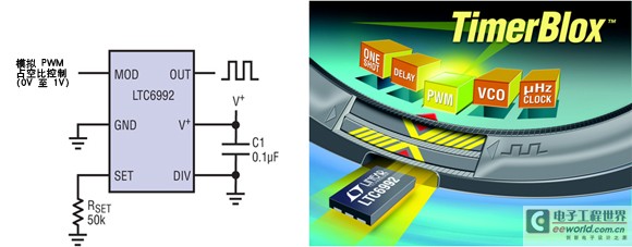 凌力爾特公司最近推出了一個(gè)基于硅振蕩器的定時(shí)器件新系列,即 TimerBloxTM 系列。這些器件含有智能電路,可提供 5 種基本定時(shí)功能:電壓控制振蕩器 (VCO)、面向長(zhǎng)持續(xù)時(shí)間定時(shí)的非常低頻率時(shí)鐘、脈沖寬度調(diào)制振蕩器 (PWM)、單脈沖發(fā)生器和延遲構(gòu)件。作為一個(gè)系列,這些器件涵蓋了 29uHz (9.5 小時(shí)) 至 2MHz 的工作范圍,具有 98% 或更高的典型頻率或時(shí)間準(zhǔn)確度。每個(gè) TimerBlox 器件提供 8 種單獨(dú)的工作頻率 / 時(shí)間范圍,可用一個(gè)簡(jiǎn)單的電阻分壓器進(jìn)行選擇。一旦范圍選定,那么用戶就可以用 25kΩ 至 800kΩ 的單個(gè)電阻器設(shè)定準(zhǔn)確的頻率或時(shí)間。這種架構(gòu)允許 TimerBlox 系列器件涵蓋很寬的工作范圍,同時(shí)確保電阻器尺寸對(duì)總體準(zhǔn)確度或功耗產(chǎn)生的影響可以忽略不計(jì) (通過設(shè)定電流產(chǎn)生的雜散電流和功耗可以忽略不計(jì))。TimerBlox 系列器件在 2.25V 至 5.5V 的電源電壓范圍內(nèi)工作,電源電流范圍為 60uA 至 250uA,而且 TimerBlox 器件提供快速、首周期準(zhǔn)確的啟動(dòng)。20mA 輸出提供和吸收能力允許直接驅(qū)動(dòng)光隔離器和變壓器,以實(shí)現(xiàn)電氣隔離。TimerBlox 系列器件采用 SOT23 和纖巧的 DFN 封裝,所有器件都可在 -40°C 至 125°C 的溫度范圍內(nèi)工作。所有這些特色都是為了確保 TimerBlox 系列器件提供最簡(jiǎn)單、靈活和可編程的定時(shí)解決方案。采用這些器件,設(shè)計(jì)師就不會(huì)面對(duì)利用 RC 電路實(shí)現(xiàn)定時(shí)器或提供時(shí)鐘時(shí)所需的無(wú)情選擇了。RC 電路的作用現(xiàn)在可以縮回到一種更適中的水平,人們不再期望用 RC 電路應(yīng)對(duì)“真正嚴(yán)重的定時(shí)問題”了。