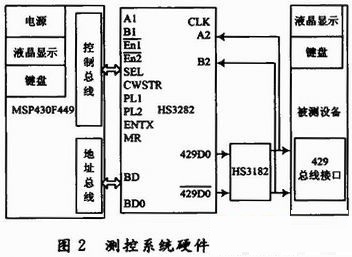接口的實現(xiàn)方式選用Intersil公司的HS3282芯片,它支持ARINC429通信規(guī)范和其他串行數(shù)據(jù)傳輸協(xié)議,采用+5 V供電。具有兩路接收、一路發(fā)送的功能。通道接收器之間也是獨立的并行接收,可以直接連接到ARINC429總線,而不需電平轉(zhuǎn)換。使用時和HS3182總線驅(qū)動器配合,就可以發(fā)送數(shù)據(jù)進(jìn)行二級差分驅(qū)動,產(chǎn)生ARINC429總線的電平。HS3282數(shù)據(jù)總線為16位,MSP430F449為16位單片機,從而避免了8位單片機為解決系統(tǒng)總線匹配的問題需要采用鎖存器作為虛擬總線的煩惱,提高了測控系統(tǒng)的可靠性。