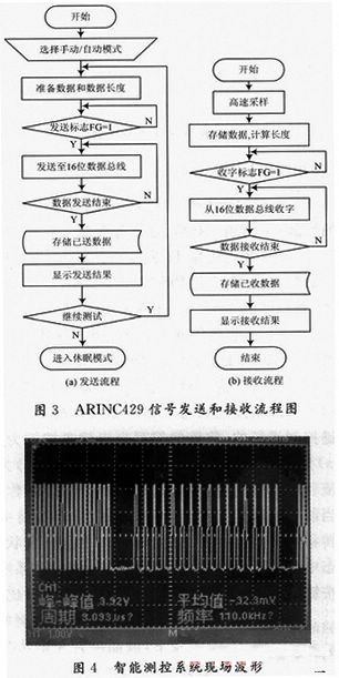 對此便攜式低功耗雷達(dá)導(dǎo)航儀智能測控系統(tǒng)的測試內(nèi)容包括:發(fā)送數(shù)據(jù)、接收數(shù)據(jù)和發(fā)送數(shù)據(jù)間隔等測試。由于HS3282的兩路輸出是差分輸出的,所以只需要測試其中的一路就可以了。智能測控系統(tǒng)現(xiàn)場波形如圖4所示,發(fā)送的數(shù)據(jù)采用自動模式,控制字為奇校驗。通過示波器直接觀察HS3282芯片的輸出信號,輸出電平是3.92 V,滿足TTL的電平要求。而數(shù)據(jù)之間的時間間隔,即組間數(shù)據(jù)4位間隔。由單片機的延時程序即可完成。