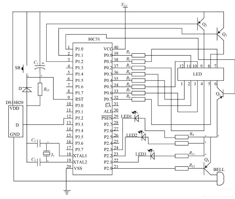 包括信號采集、系統(tǒng)控制、數(shù)字顯示、高溫報警四個部分。傳感器DS18B20 為信號采集器件所采集到的溫度信號,通過內(nèi)部處理由傳感器的DQ 端送到單片機P3. 2 端口,經(jīng)單片機的計算處理后,由P0 口和P1 口分別作為4 位共陽數(shù)碼管的段控信號和位控信號,共同完成對所測溫度值的數(shù)字顯示,最高位是符號顯示,如顯示負號“-”時,表示當前溫度是負溫度,否則為正溫度;由P2. 0 端口控制蜂鳴器,當測量的溫度超過“預(yù)設(shè)報警溫度”時,發(fā)出提示音報警; P2. 1~ P2. 3 端口來控制黃、綠、紅3 個發(fā)光二極管分別表示低溫、正常、高溫三種溫度狀態(tài)。石英晶體JT 和電容C2 ,C3 共同組成晶振電路; 電容C1 、電阻R 13、S B 共同構(gòu)成復位電路; 其中電阻R13為下拉電阻,SB 為手動復位按鈕。