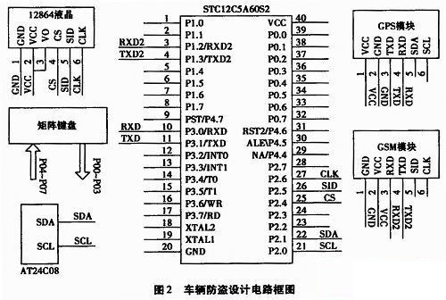 人機(jī)接口包括矩陣鍵盤(pán)和液晶顯示部分,主要用于實(shí)現(xiàn)預(yù)置的手機(jī)號(hào)碼的輸入、顯示和防盜功能的開(kāi)啟與關(guān)閉功能。存儲(chǔ)器采用HC總線(xiàn)的EEPROM AT24C08,其為非易失性存儲(chǔ)器,存儲(chǔ)的數(shù)據(jù)可保存100年以上,并可進(jìn)行上萬(wàn)次擦寫(xiě)。單片機(jī)將GPS上接收來(lái)的數(shù)據(jù)進(jìn)行解析后,所獲得的車(chē)輛所處的經(jīng)、緯度,速度等信息保存在該存儲(chǔ)器中,為以后做為公安機(jī)關(guān)的證據(jù)依據(jù)。