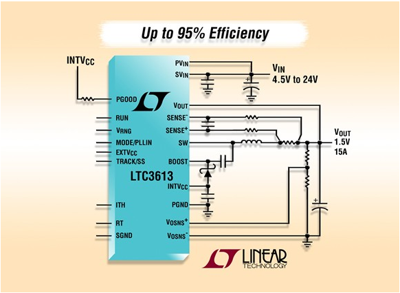 凌力爾特公司 (Linear Technology Corporation) 推出高頻、接通時(shí)間受控的同步降壓型 DC/DC 轉(zhuǎn)換器 LTC3613,該器件具差分輸出電壓采樣和時(shí)鐘同步。受控的接通時(shí)間和谷值電流模式架構(gòu)在瞬態(tài)事件時(shí)可通過提高工作頻率以實(shí)現(xiàn)非??焖俚乃矐B(tài)響應(yīng),從而允許 LTC3613 僅在幾個(gè)時(shí)鐘周期內(nèi)就可從大的負(fù)載步進(jìn)中恢復(fù)。其 4.5V 至 24V 的輸入范圍支持多種應(yīng)用,其中包括大多數(shù)中間總線電壓。集成的 N 溝道 MOSFET 可在 0.6V 至 5.5V 的輸出電壓范圍內(nèi)提供高達(dá) 15A 的連續(xù)負(fù)載電流,從而使該器件非常適用于負(fù)載點(diǎn)應(yīng)用。
