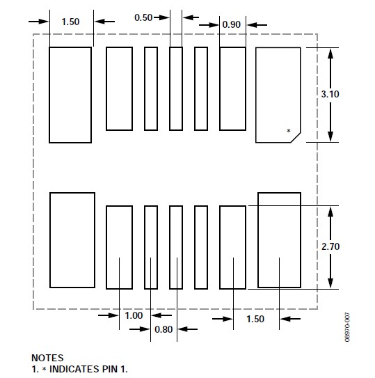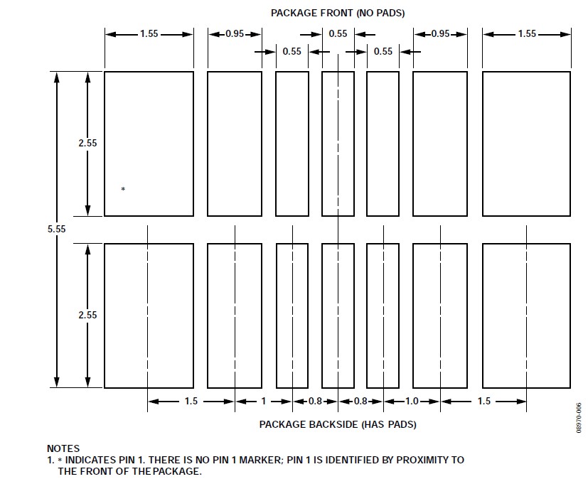 關(guān)于垂直和水平安裝方向的CVMP焊盤(pán)布局(焊盤(pán)圖形),請(qǐng)參閱本應(yīng)用筆記的"焊盤(pán)布局"部分。CVMP背面的焊盤(pán)布局如圖7所示。注意,封裝正面上有一些額外的焊盤(pán)(見(jiàn)圖4)沒(méi)有顯示在焊盤(pán)布局中,這些焊盤(pán)用作測(cè)試點(diǎn),不應(yīng)進(jìn)行電氣連接。
