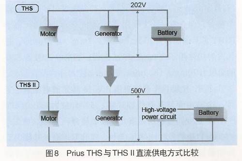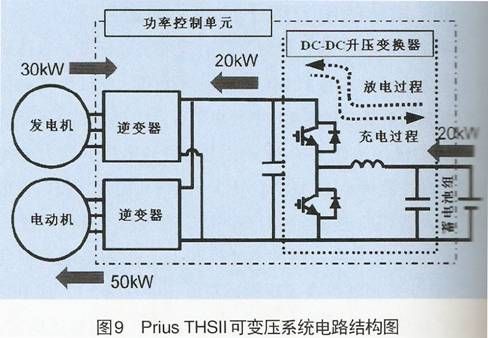 在THS中,蓄電池通過逆變器直接與電機和發(fā)電機相連(見圖8);而THSⅡ中,蓄電池組輸出的電壓首先通過DC—DC升壓變換器進行升壓操作,然后再與逆變器相連,因此逆變器的直流母線電壓從原THS的220V提升為現在的500V。