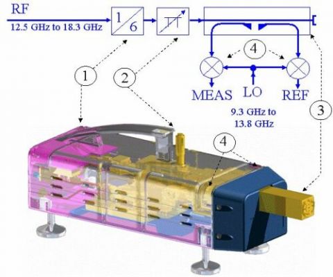 圖1顯示了R&S ZVA-Z110內(nèi)部的CAD結(jié)構(gòu)圖和原理框圖該變頻模塊包含用作隔離參考和測量信號(hào)的通道源倍頻器、可調(diào)節(jié)波導(dǎo)衰減器、定向耦合器這些參考和測量通道通過諧波混頻器進(jìn)行下變頻