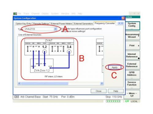 在圖2所示的A、B、C三個(gè)區(qū)域進(jìn)行如下測量配置:在A區(qū)擇變頻模塊型號(hào),在B區(qū)選擇電纜連接方式,在C區(qū)點(diǎn)擊應(yīng)用按鍵并連接變頻模塊到網(wǎng)絡(luò)分析儀(見圖 3),然后將頻率軸調(diào)節(jié)成75GHz到110GHz(見圖2底部)此外,變頻模塊的所有測量參數(shù)會(huì)被自動(dòng)設(shè)置(例如射頻和本振的倍頻系數(shù)、最佳功率電平、復(fù)位設(shè)置、連接類型WR10,以及定義和選擇波導(dǎo)校準(zhǔn)套件R&S ZV-WR10)