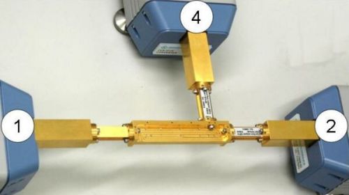 UOSM 校準(zhǔn)技術(shù)的優(yōu)點(diǎn)是可以利用一個(gè)未知的直通件作為標(biāo)準(zhǔn)件這一未知的直通件僅要求具有很好的正、反向互易性,因此,該未知直通件不要求具有良好的匹配和低損耗特性甚至價(jià)格低廉的、帶帶標(biāo)準(zhǔn)法蘭盤的波導(dǎo)管節(jié)、波導(dǎo)彎頭和波導(dǎo)扭轉(zhuǎn)接頭,只要具有互易特性都可以作為直通件在校準(zhǔn)后所有對輸出端口方向的改變都會(huì)造成(可避免的)精度損失,因此在這個(gè)例子當(dāng)中,一個(gè)H面的波導(dǎo)彎頭在波導(dǎo)測試端口1和4,以及測試端口2和4之間建立直通波導(dǎo)測試端口1和2是通過兩個(gè)測試端口的直接連接而建立直通的