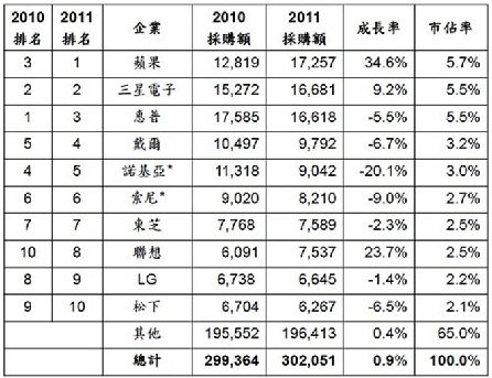 Gartner指出,蘋(píng)果在智慧型手機(jī)市場(chǎng)的市占率提升,平板媒體在2011年亦有亮眼業(yè)績(jī)。雖然2011年DRAM價(jià)格急遽下滑,許多PC業(yè)者緊縮整體半導(dǎo)體的需求,但隨著MacBookAir的成功,使蘋(píng)果PC事業(yè)對(duì)半導(dǎo)體晶片的需求增加。