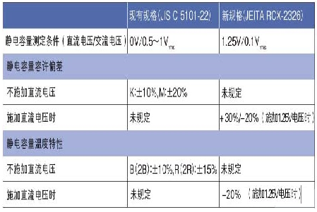 在靜電容量的測(cè)定上,新規(guī)格改為在施加1.25V直流電壓和0.1Vrms交流電壓的狀態(tài)下對(duì)容量進(jìn)行測(cè)定。而原來(lái)的“JIS C 5101-22”規(guī)格并不要求施加直流電壓,只是要求在施加0.5~1Vrms交流電壓的狀態(tài)下對(duì)容量進(jìn)行測(cè)定?! ?br />