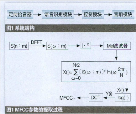 車載語音控制器系統(tǒng)由定向拾音器、語音識別模塊、控制模塊和音響模塊組成。系統(tǒng)的功能是:由拾音器采集駕駛員發(fā)出的語音命令,利用語音識別模塊將拾音器輸出的語音物理聲音信號轉(zhuǎn)變成語音數(shù)字信號,并識別出語音命令對應的漢字或詞語,之后由控制模塊產(chǎn)生與之對應的詞條編碼指令,通過系統(tǒng)I/O口線將控制命令傳達給音響,車載音響接收到控制指令產(chǎn)生動作,響應駕駛員的語音命令,比如快進、快退或音量調(diào)節(jié)等。系統(tǒng)結構及原理框圖如圖1 所示: