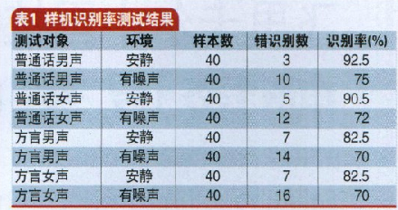 本系統(tǒng)的樣機實驗主要是測試非特定人的語音識別率和模擬開關動作的準確率。由于汽車音響的語音詞條為2~4個字,語音識別率實驗內(nèi)容為車載音響常用2字詞條指令18條、3字詞條指令12條、4字詞條指令10條,實驗對象為6人4男、2女(普通話和方言),實驗環(huán)境為噪聲干擾環(huán)境和相對安靜環(huán)境,樣機測試結果如表1所示。